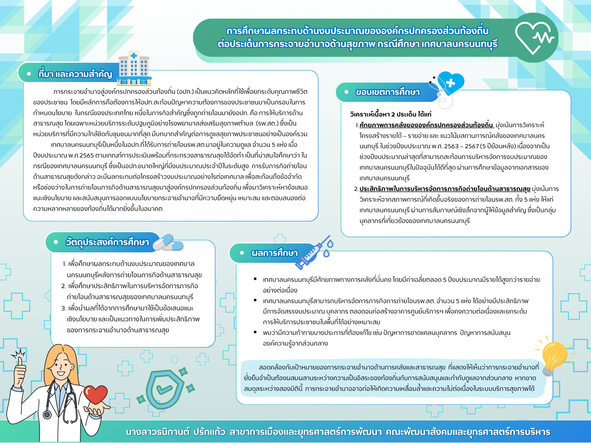 การศึกษาผลกระทบด้านงบประมาณขององค์กรปกครองส่วนท้องถิ่นต่อประเด็นการกระจายอำนาจด้านสุขภาพ กรณีศึกษา เทศบาลนครนนทบุรี | ธนิกานต์ ปรักแก้ว | อ.ดร.ภูมิ เพชรกาญจนาพงศ์ |