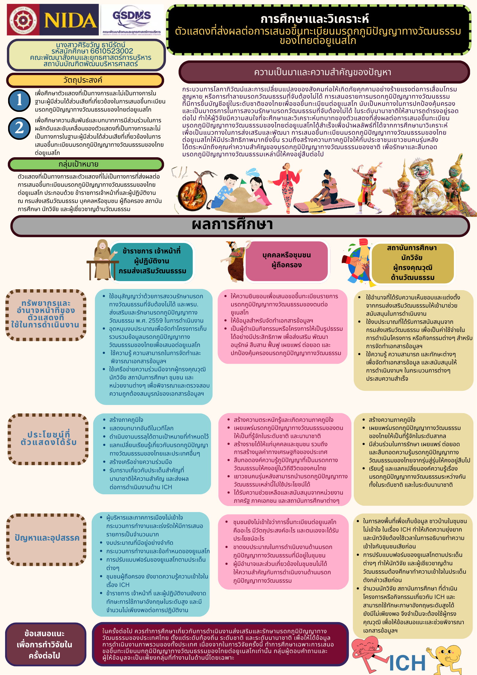 การศึกษาและวิเคราะห์ตัวแสดงที่ส่งผลต่อการเสนอขึ้นทะเบียนมรดกภูมิปัญญาทางวัฒนธรรมของไทยต่อยูเนสโก | ศิริขวัญ ธานีรัตน์ | อ.ดร.ภูมิ เพชรกาญจนาพงศ์ |