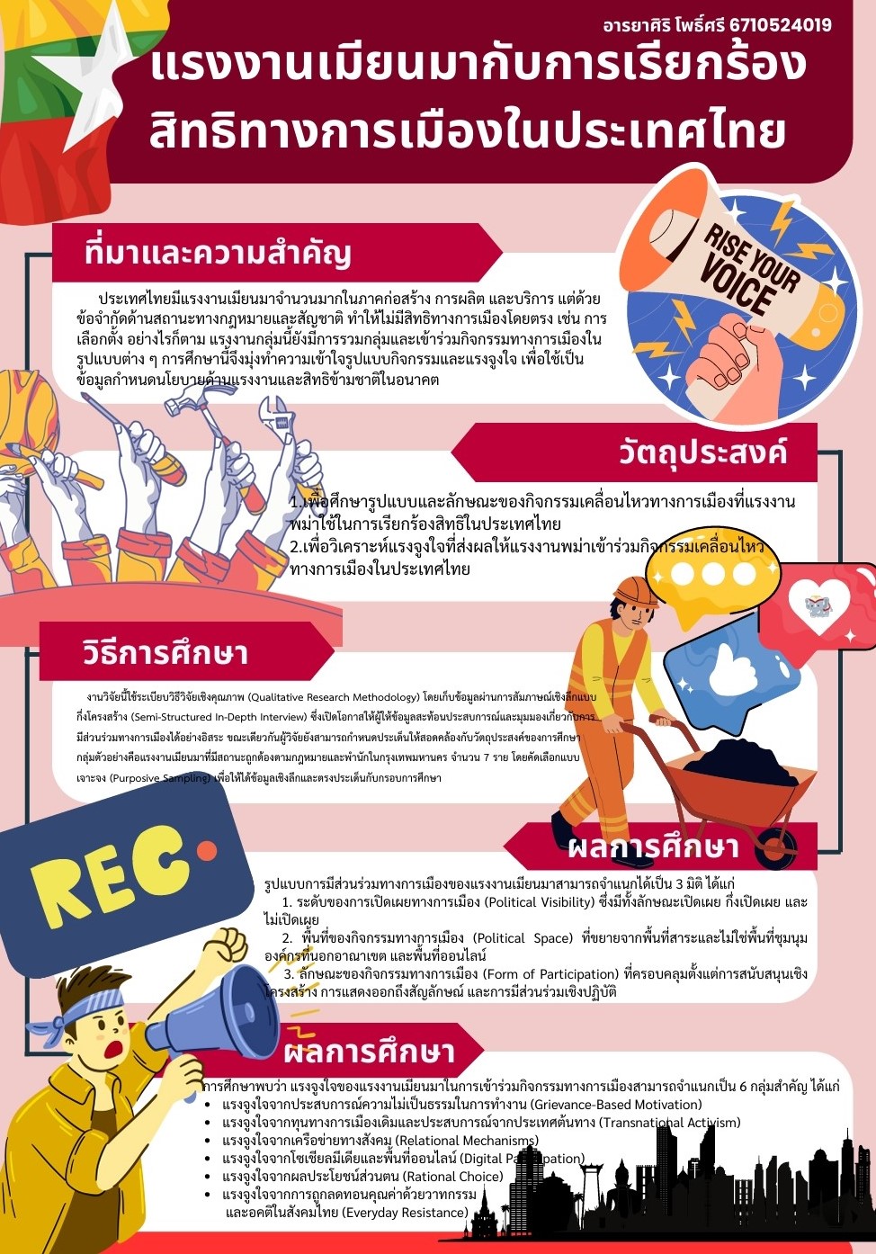 แรงงานเมียนมากับการเรียกร้องสิทธิทางการเมืองในประเทศไทย | อารยาศิริ โพธิ์ศรี | อ.ดร.ภูมิ เพชรกาญจนาพงศ์ |
